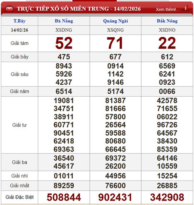 Kết quả xổ số miền Trung ngày 14/2/2026