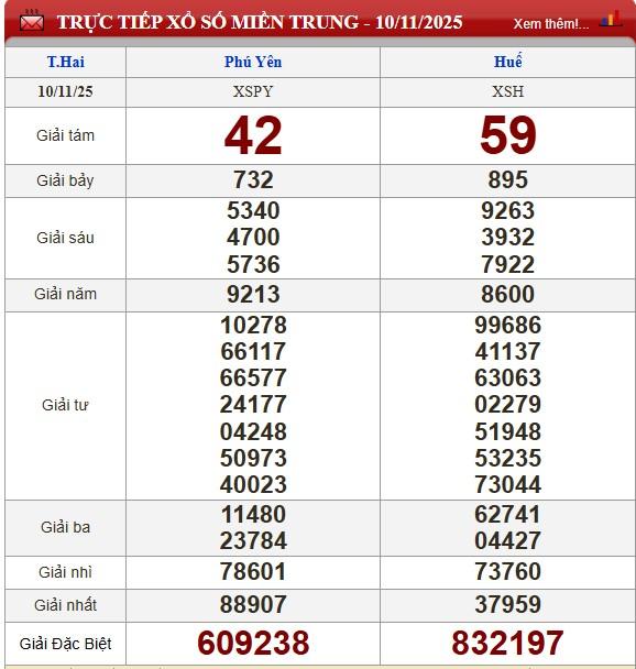Kết quả xổ số miền Trung ngày 10/11/2025