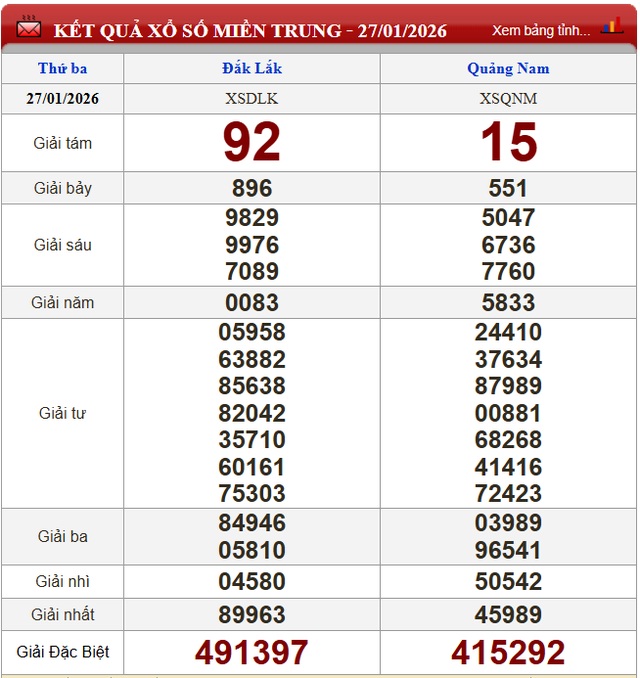 Kết quả xổ số miền Trung ngày 27/1/2026