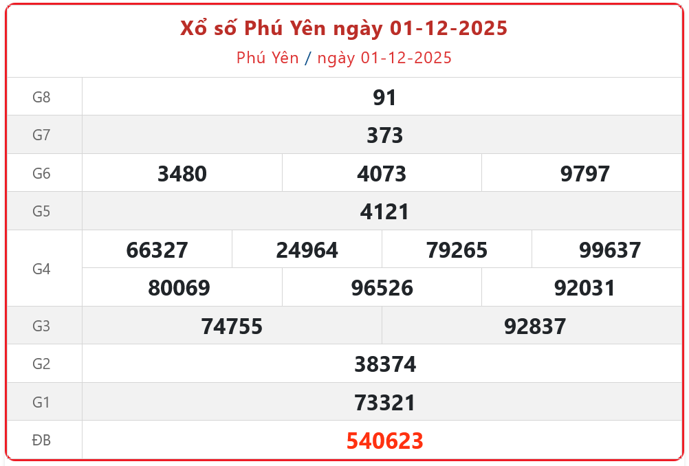 Kết quả xổ số Phú Yên thứ 2 ngày 1/12/2025