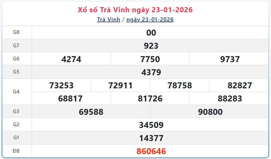 Theo dõi kết quả xổ số Trà Vinh hôm nay 23/1/2026 nhanh chóng và chính xác nhất để không bỏ lỡ thời gian nhận thưởng.