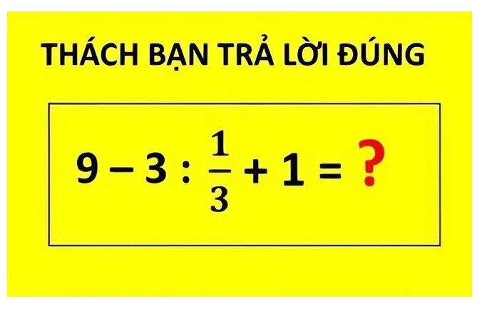 Câu đố dưới đây cho bài toán: 9 - 3 : 1/3 + 1= ?. Đố bạn không sử dụng máy tính mà vẫn có thể tìm được ra đáp án chính xác.