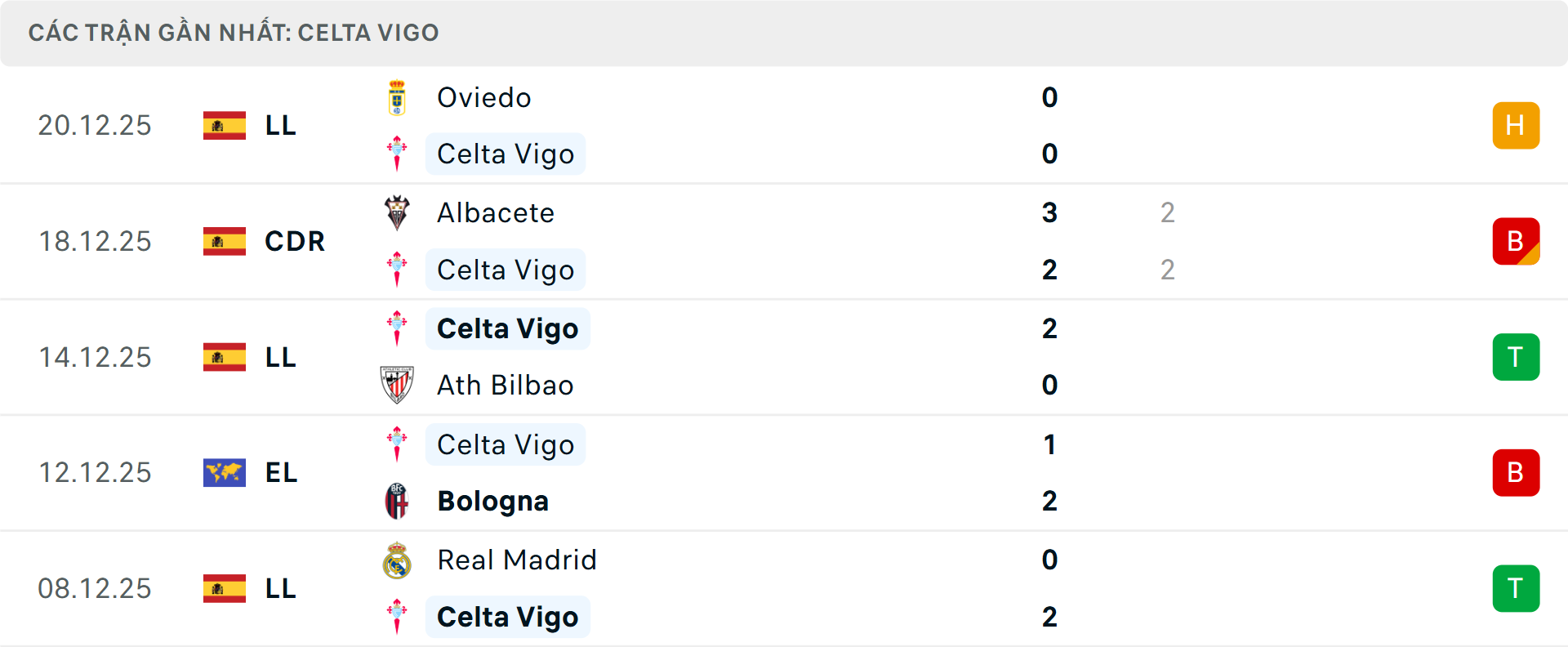 Phong độ Celta Vigo 5 trận gần nhất