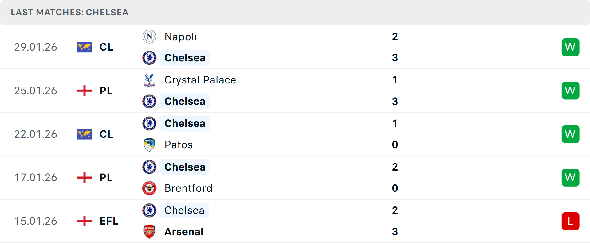 Phong độ Chelsea 5 trận gần nhất