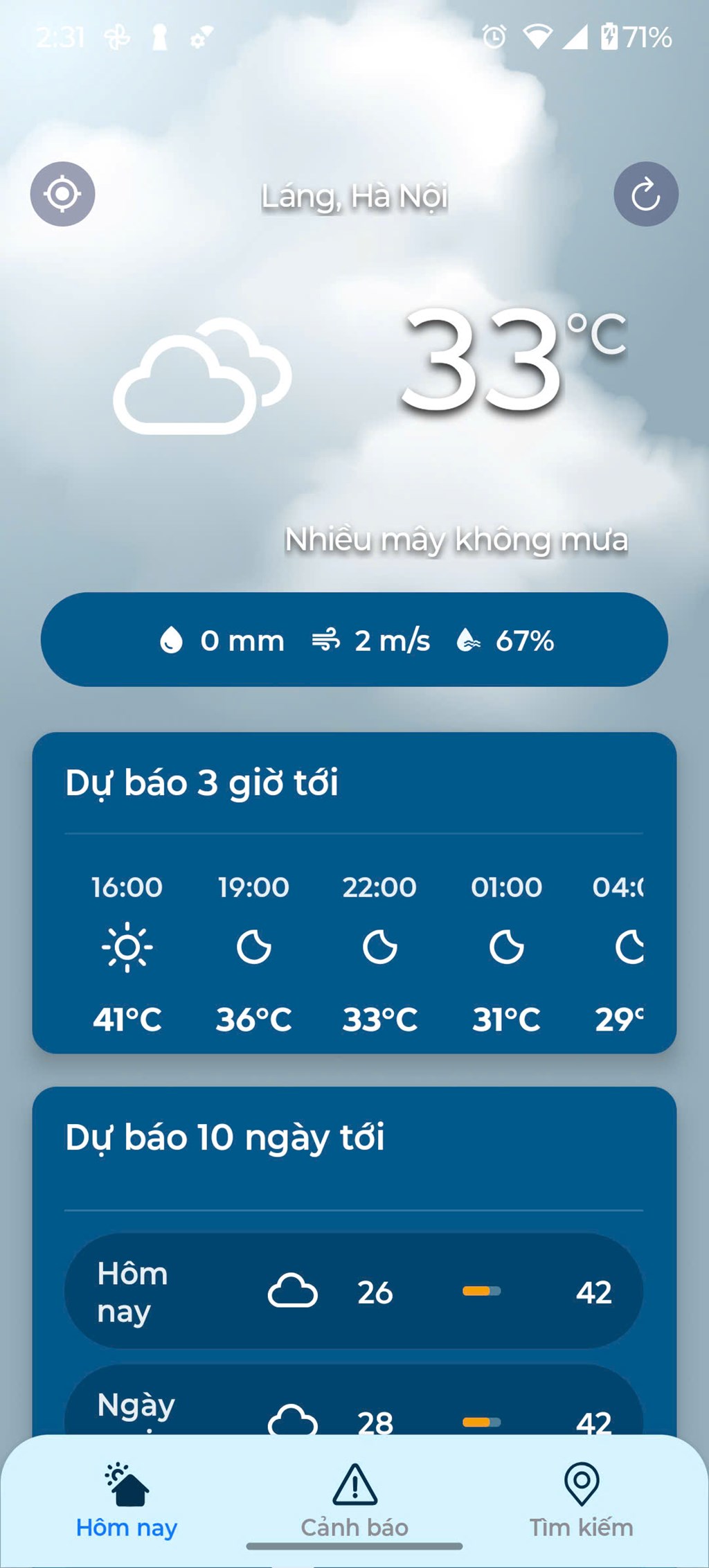 Ứng dụng hỗ trợ người dùng dễ dàng tra cứu thời tiết tại mọi xã, phường trên cả nước thông qua công cụ tìm kiếm thông minh, tích hợp gợi ý tự động. Ngoài ra, người dùng có thể lưu đến 10 vị trí yêu thích để cập nhật thông tin thường xuyên, phù hợp với nhu cầu sử dụng cá nhân.