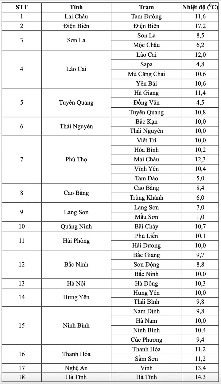 Theo đó, lúc 6h, tại Sa Pa (Lào Cai), Đồng Văn (Tuyên Quang), nhiệt độ giảm xuống còn 4°C; Tam Đảo (Phú Thọ) 5°C; Mộc Châu (Sơn La), Trùng Khánh (Cao Bằng) 6°C; Lạng Sơn 7°C; Sơn La, Cao Bằng, Sơn Động (Bắc Ninh) 8°C; Bắc Giang (Bắc Ninh), Thái Bình (Hưng Yên), Nam Định (Ninh Bình), Cúc Phương (Ninh Bình) 9°C.