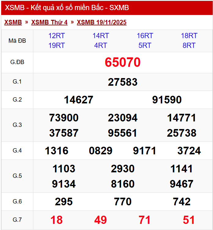 Kết quả Xổ số miền Bắc ngày 19/11/2025