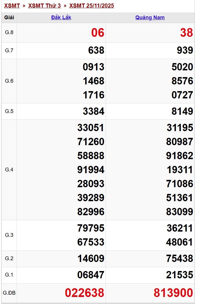 Kết quả xổ số miền Trung (XSMT) được thực hiện lúc 16 giờ 30 phút và được mở thưởng bởi Công ty xổ số kiến thiết của tỉnh Quảng Nam (XSQNA), Đắk Lắk (XSĐL). Kết quả của đài nào sẽ được mở thưởng tại trường quay của tỉnh đó. Xổ số hôm nay - KQXSMT ngày 25/11 được quay thưởng bắt đầu từ giải tám cho đến giải nhất, cuối cùng là công bố kết quả giải đặc biệt.