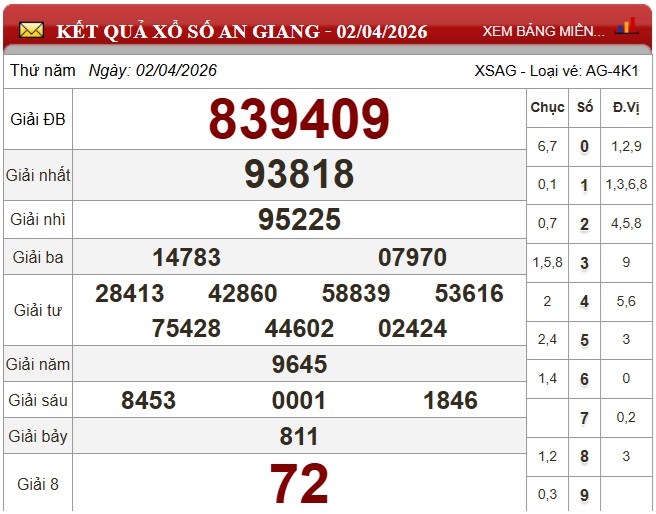 XSAG 9/4/2026. Kết quả xổ số hôm nay ngày 9/4. Trực tiếp KQXSAG ngày 9/4. Kết quả xổ số An Giang hôm nay ngày 9/4/2026. Kết quả xổ số An Giang Thứ Năm ngày 9/4/2026.