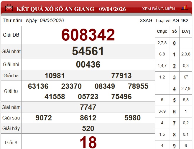 Trực tiếp Kết quả xổ số An Giang hôm nay - Kết quả XSAG 9/4 - XSAG hôm nay Thứ Năm ngày 9/4/2026.