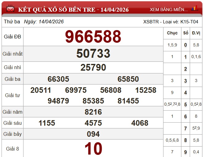 Trực tiếp Kết quả xổ số Bến Tre hôm nay - Kết quả XSBT 14/4 - XSBT hôm nay Thứ Ba ngày 14/4/2026.