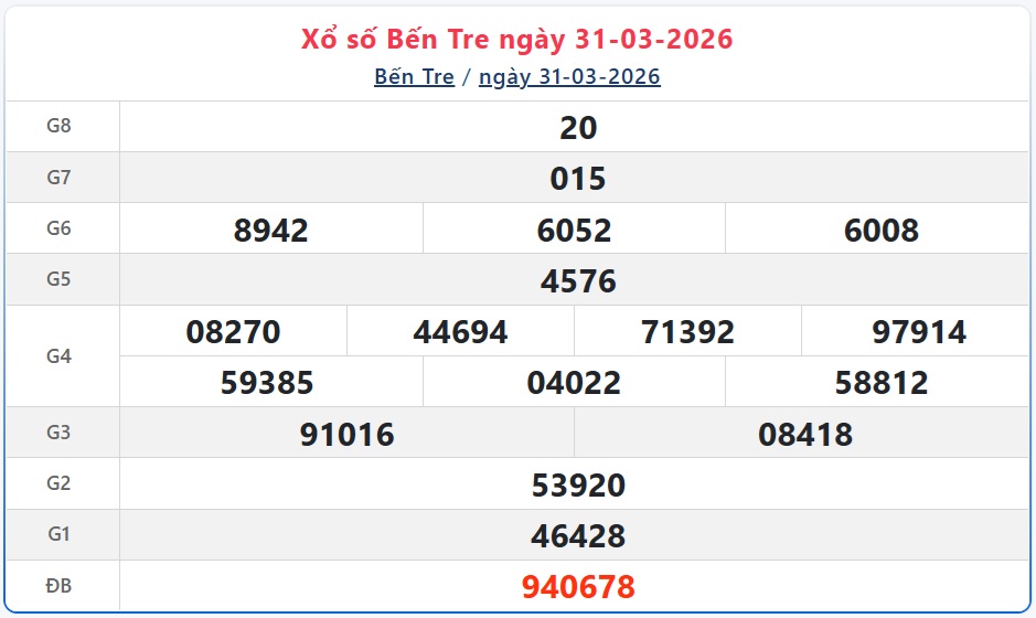 Kết quả xổ số Bến Tre Thứ Ba ngày 31/3/2026