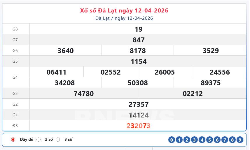 Kết quả xổ số Đà Lạt Chủ nhật ngày 12/4/2026