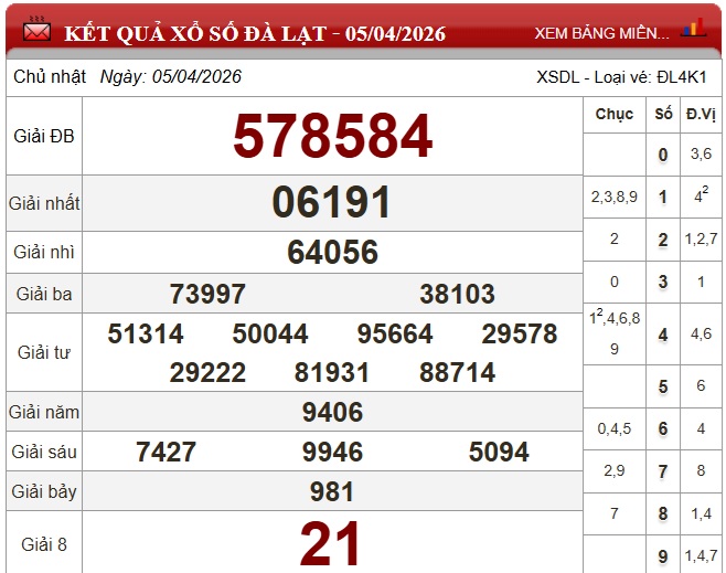 XSDL 5/4. Kết quả xổ số Đà Lạt hôm nay 5/4/2026 được quay vào lúc 16 giờ 15 phút, mở thưởng bởi Công ty TNHH MTV Xổ số kiến thiết tỉnh Lâm Đồng. Kết quả XSDL 5/4/2026 được công bố lần lượt từ giải tám cho đến giải nhất, cuối cùng là giải đặc biệt.