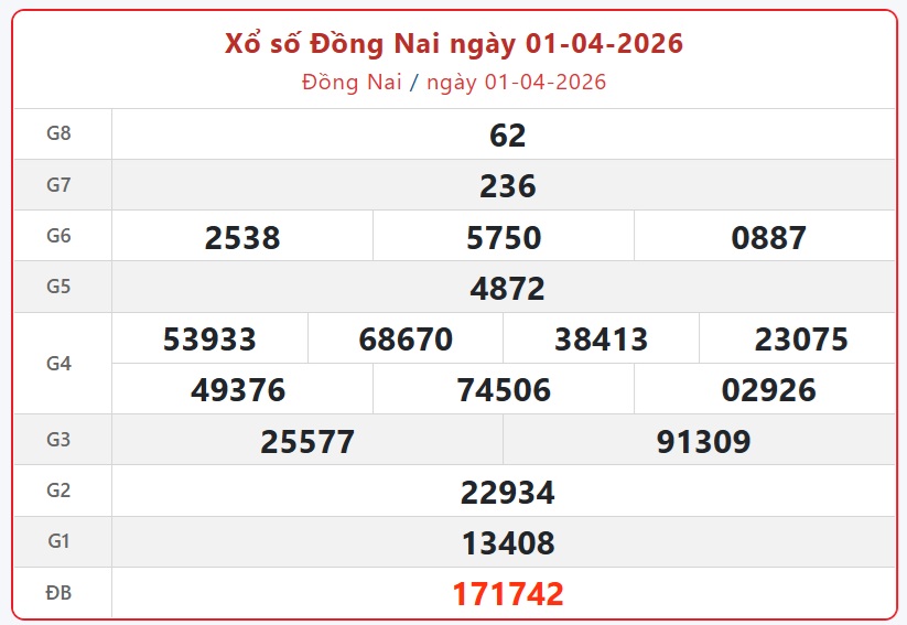 Kết quả xổ số Đồng Nai Thứ Tư ngày 1/4/2026
