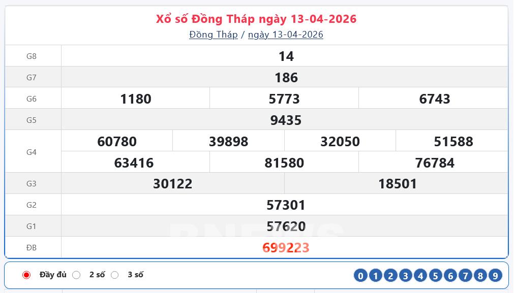 Kết quả xổ số Đồng Tháp Thứ Hai ngày 13/4/2026