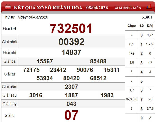 Kết quả xổ số Khánh Hòa hôm nay 8/4/2026 do Công ty TNHH MTV Xổ số kiến thiết Khánh Hòa quay số mở thưởng vào lúc 17h15. Kết quả XSKH 8/4/2026 sẽ công bố lần lượt từ giải tám cho đến giải nhất, cuối cùng là giải đặc biệt.