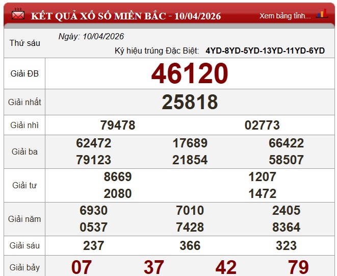 Kết quả Xổ số miền Bắc ngày 10/4/2026