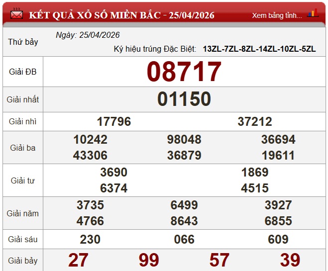 XSMB 25/4/2026. Kết quả xổ số hôm nay ngày 25/4. Trực tiếp KQXSMB ngày 25/4. KQXSMB 25/4. Kết quả xổ số miền Bắc hôm nay Thứ Bảy ngày 25/4/2026.
