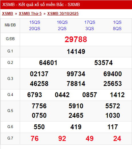 Kết quả Xổ số miền Bắc ngày 30/10/2025