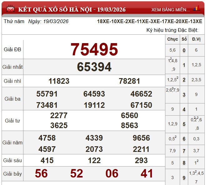 Kết quả Xổ số miền Bắc ngày 19/3/2026