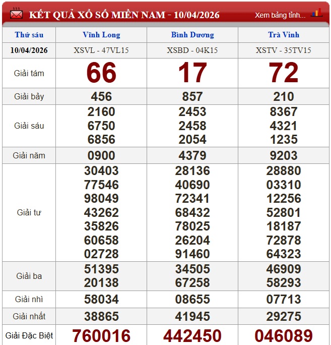 Kết quả xổ số miền Nam ngày 10/4/2026