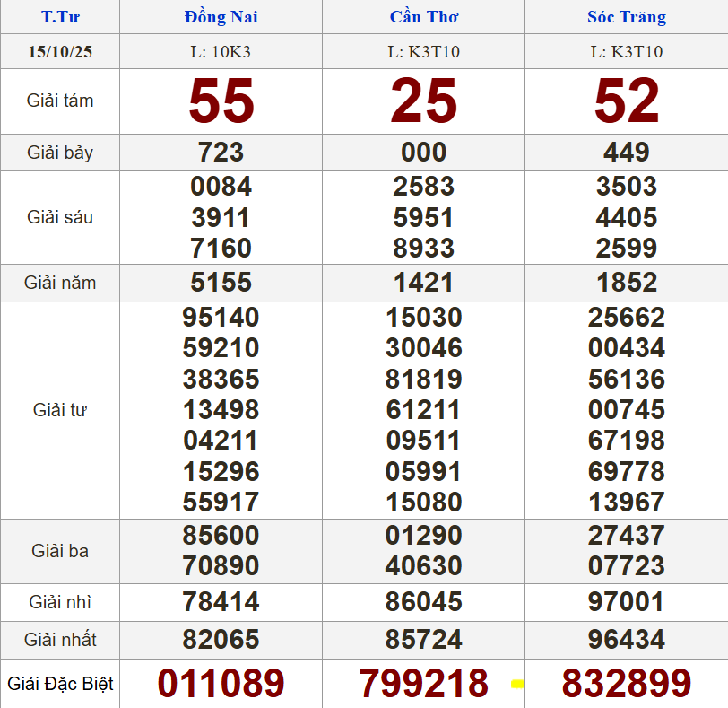 • Thứ Tư: Đồng Nai - Cần Thơ - Sóc Trăng