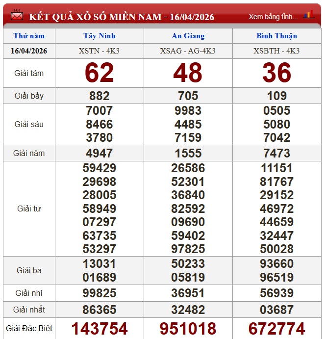 Kết quả xổ số miền Nam ngày 16/4/2026