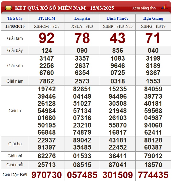 Kết quả xổ số miền Nam ngày 15/3/2026