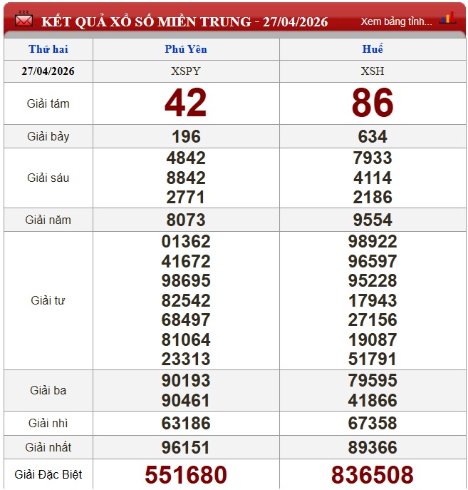 Kết quả xổ số miền Trung ngày 27/4/2026