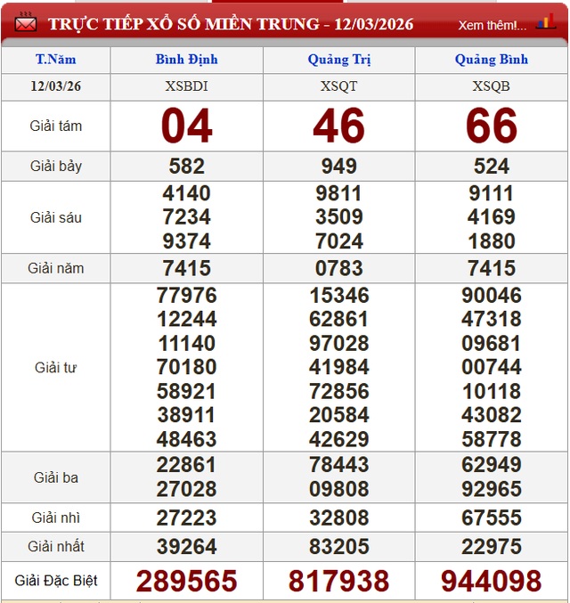 Kết quả xổ số miền Trung ngày 12/3/2026