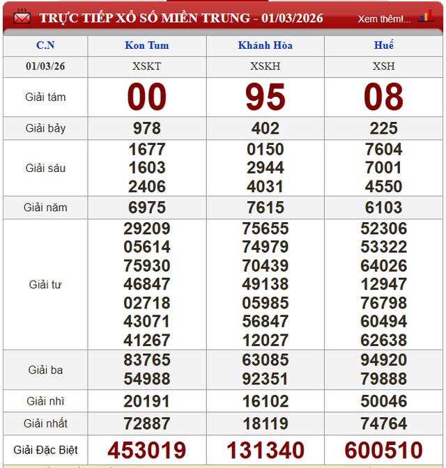 Kết quả xổ số miền Trung ngày 1/3/2026