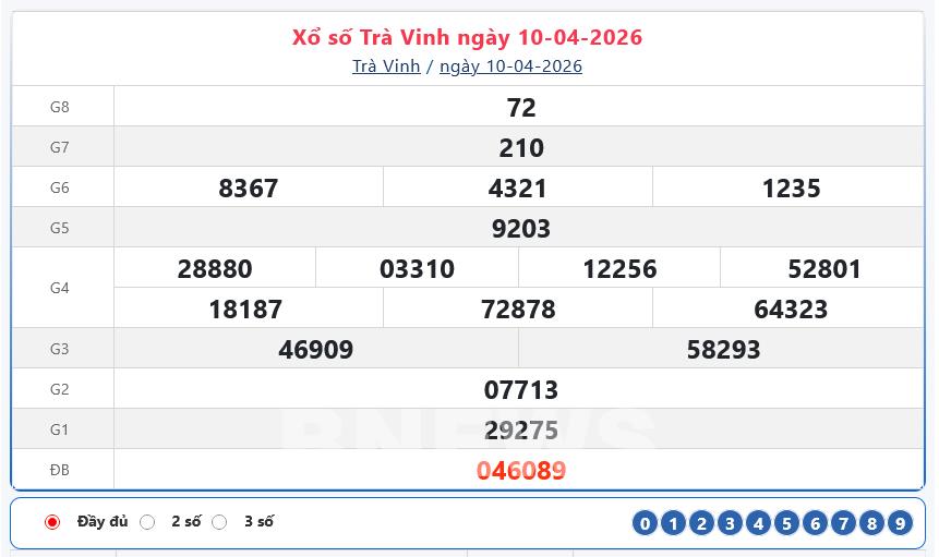 Kết quả xổ số Trà Vinh ngày 10/4/2026