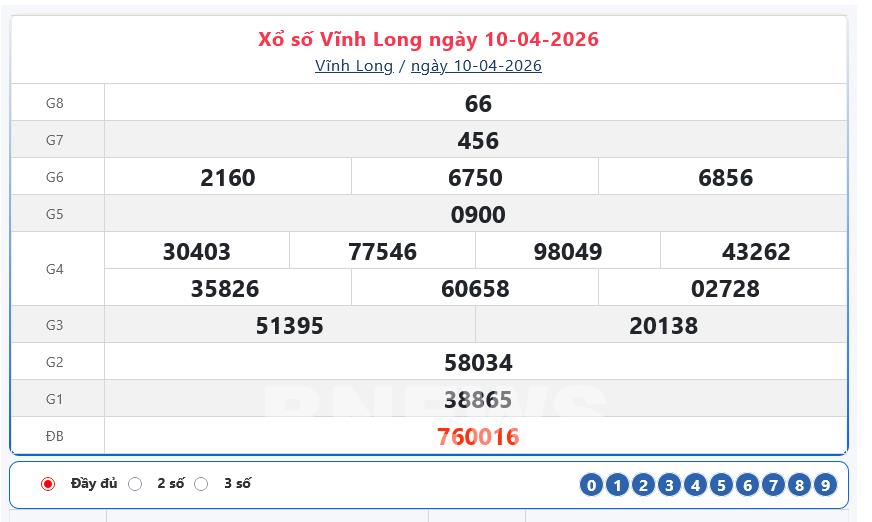 Kết quả xổ số Vĩnh Long ngày 10/4/2026