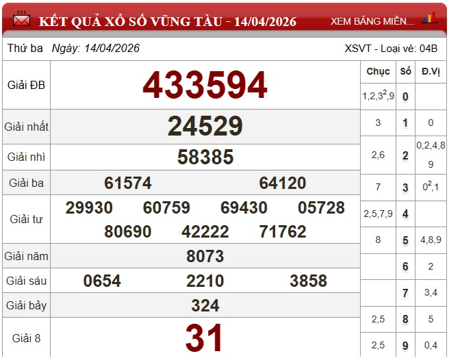 Trực tiếp Kết quả xổ số Vũng Tàu hôm nay - Kết quả XSVT 14/4 - XSVT hôm nay Thứ Ba ngày 14/4/2026.